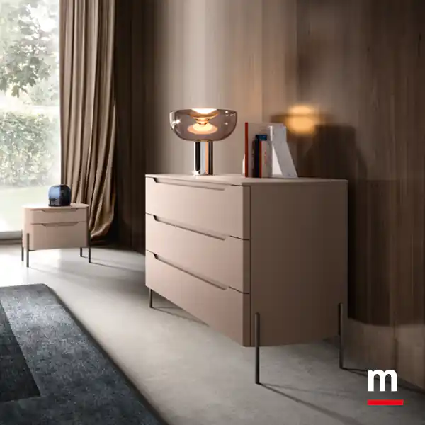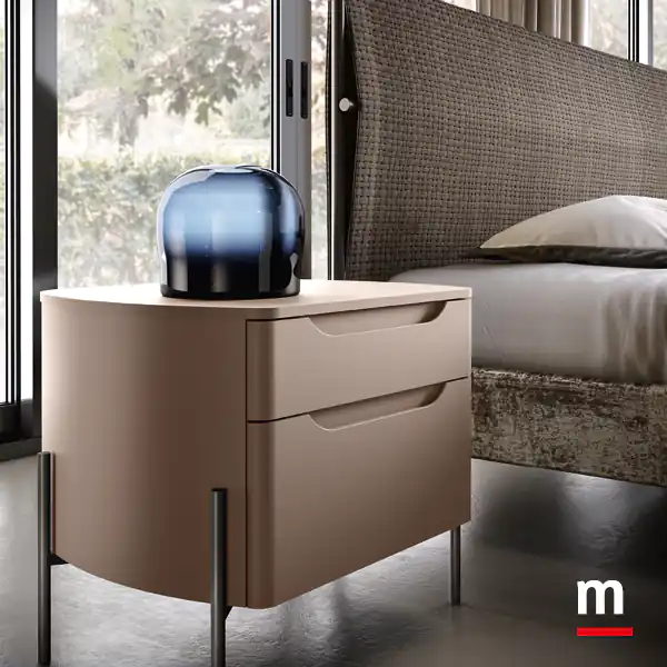 Camera Ambra con letto Rigel. Design su misura per il gruppo Ambra: originale e inconfondibile. Si distingue per essere l’unica collezione dalle forme curve che richiama uno stile classico ma sempre al passo con i tempi.