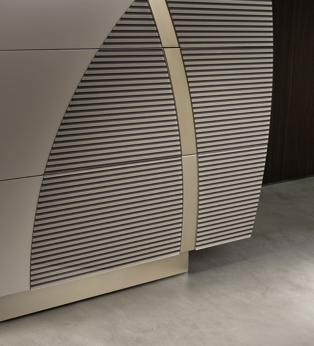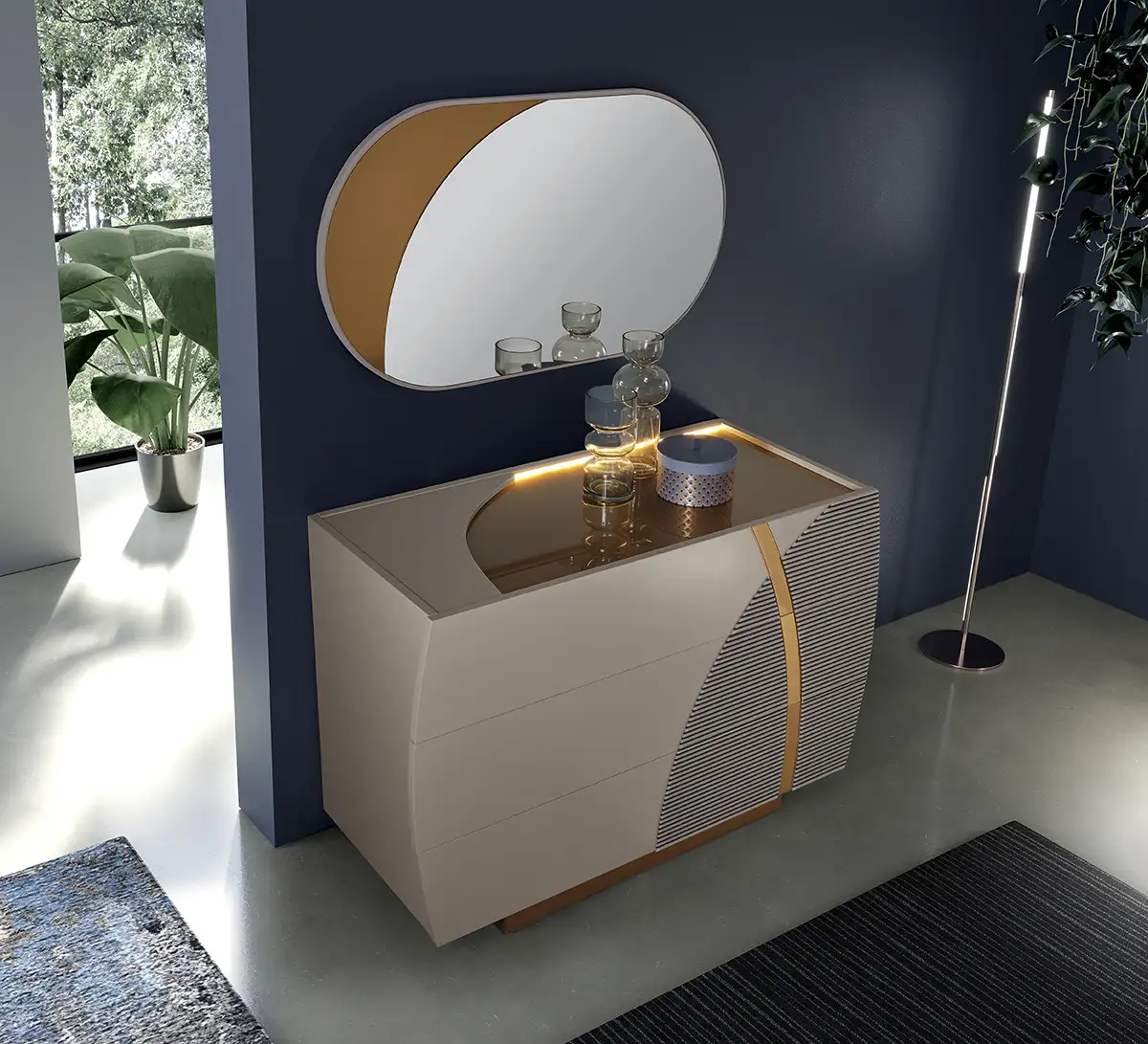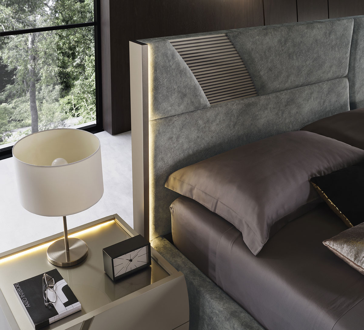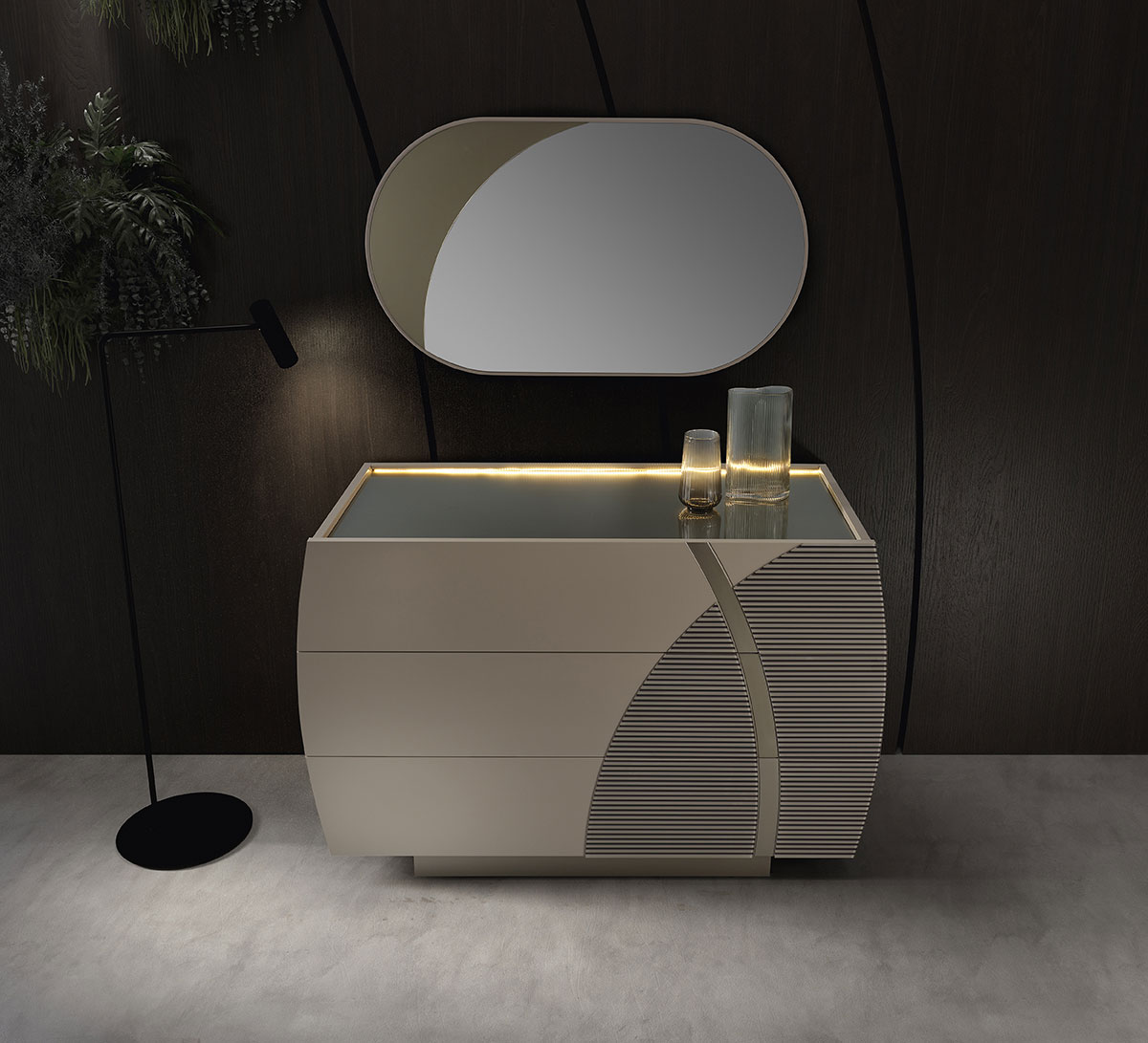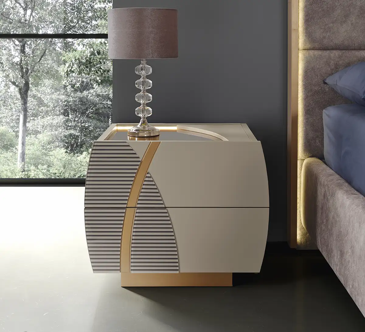 SABER re-inventa la xzona notte con una collezione al passo con i tempi: contrasti cromatici e raffinati vetri con effetto canneté caratterizzano Dorothy, personalizzabile grazie ai dettagli in finitura Rame e Champagne e numerosi optional per renderla unica.